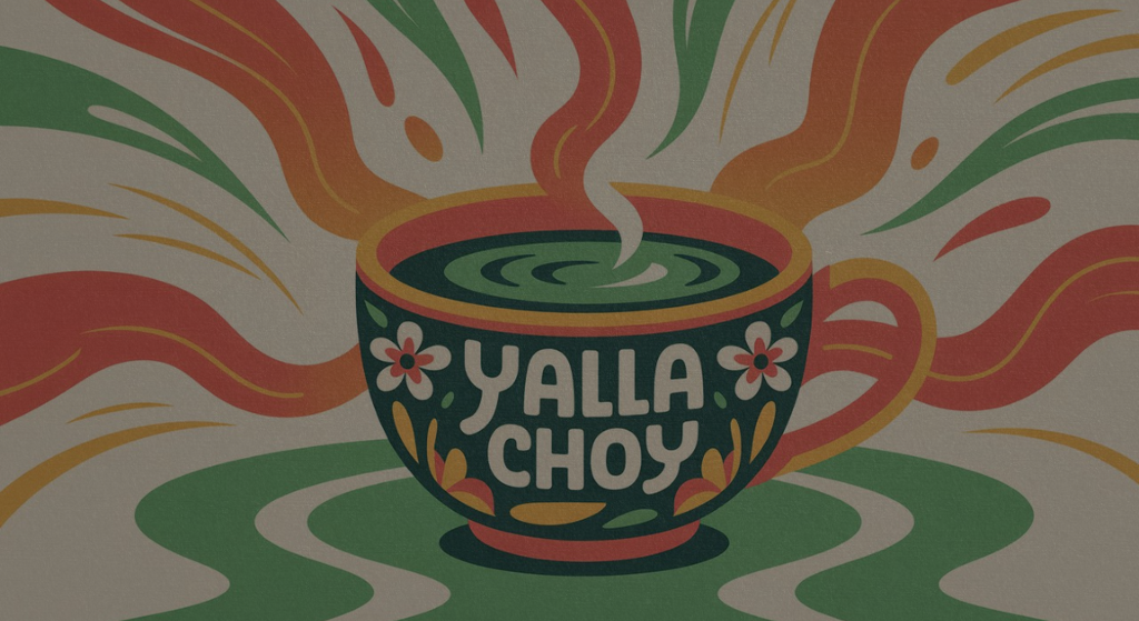 “Yalla Choy” is a fun phrase made by mixing words from different cultures. In Arabic, “Yalla” means “come on” or “let’s go.” The word “Choy” sounds like “chai” (tea) in many Asian languages and can also hint at something relaxing or comforting.